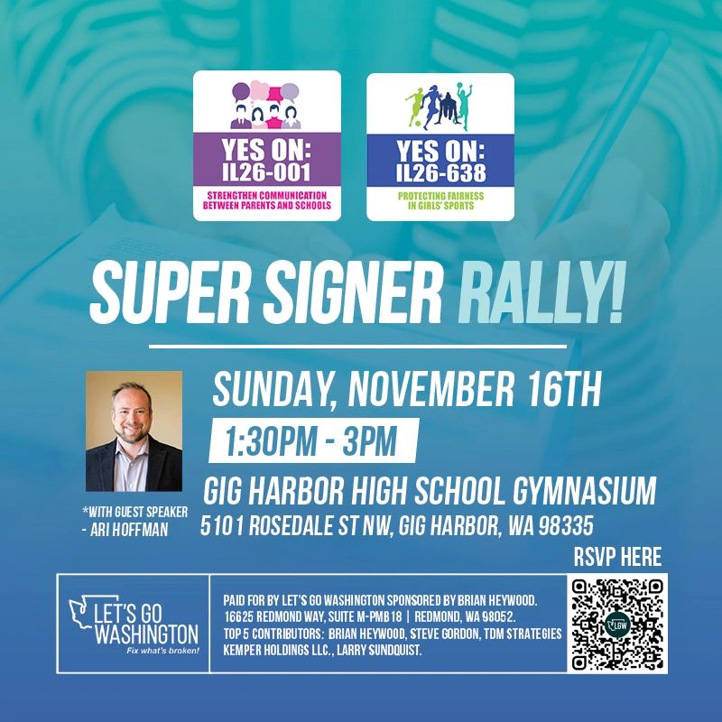 The GHRC recommends signing 3 initiative petitions that are currently being circulated. The Washington State Republican Party is sponsoring IL26-126, requiring proof of citizenship to register to vote in this state. The other 2 sponsored by Let’s Go Washington are IL26-001, strengthening communication between parents and schools, and IL26-638, protecting fairness in girls sports. To sign or request copies that you can get filled, or if you would like to volunteer at a local petition signing station, please email us at gigharborrepublicans@gmail.comand we will help you get involved.